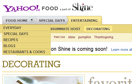 Karen pointed a blog post out to me by Geoff Teehan, which in turn points to the Yahoo! Food site. The navigation here is a combination of tabs and breadcrumb trail.