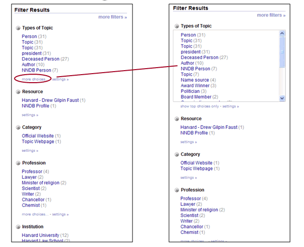 It’s rare to find an example of paging within a set of a faceted filters. Semedico uses this technique, and the interaction is fairly smooth without a page reload–just the values in the facet component update when paging. It’s easy to overlook the paging mechanism, however, so I’m not sure many people will actually find and use this feature.