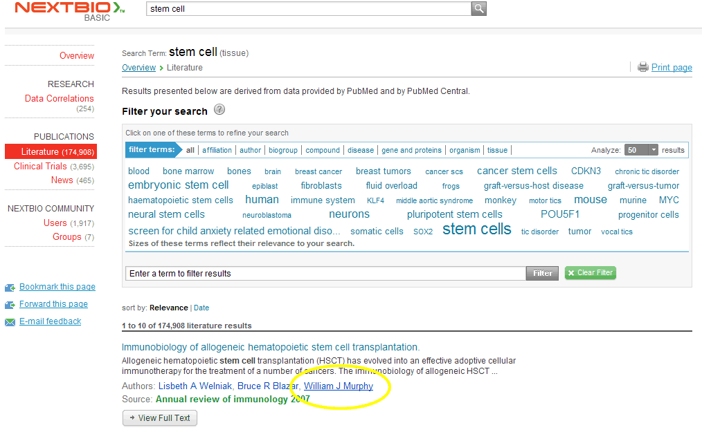 For example, NextBio links author names in the results list (circled in yellow in Figure 6). Clicking one pivots to a new results list for that author. In this example, a complete list of all author names would be quite long to display.