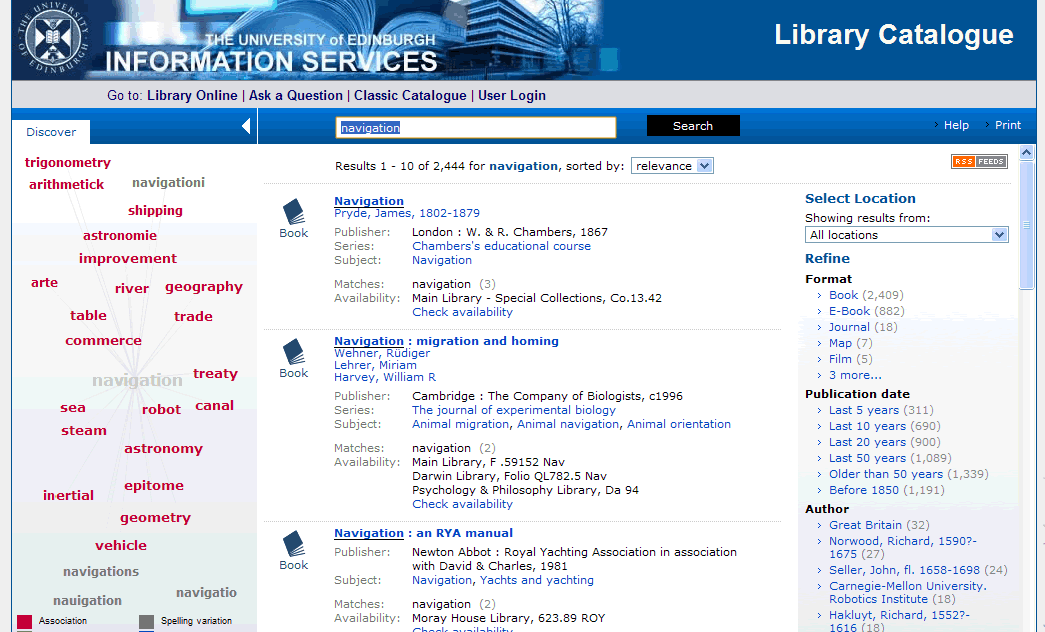 The University of Edinburgh library catalogue positions faceted navigation filters for search results on the right. This makes use of the AquaBrowser discovery interface from Serials Solutions.
