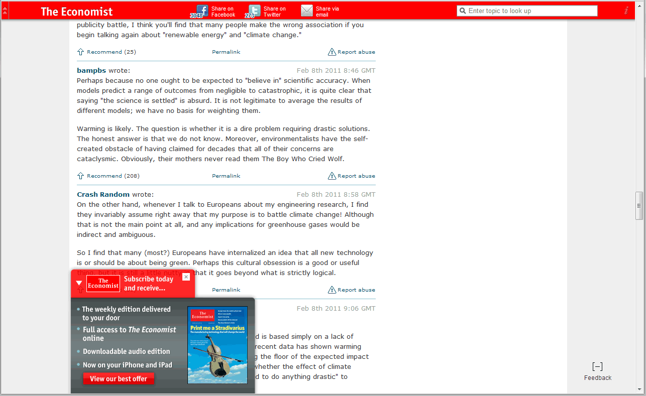 The Economist.com site uses two scroll activated menus (Figure 2). First, there is one at the top that appears fairly quickly as you scroll down–see the red bar across the page. This has some social media options and a helpful search feature.