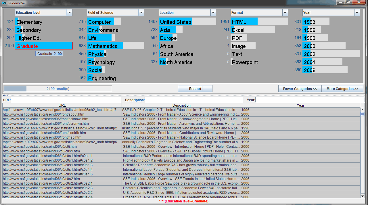 This interaction is dynamic and instant, so you get a feel for the relationship of existing magnitude and new magnitude quickly. In the above screen shot, you’d know that by clicking on “Education level: Graduate” you will not get any documents in PDF, text or PowerPoint formats. This might affect your decision to select that filter at all, thus potentially saving you a step.